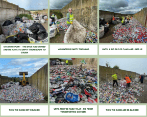 “How it started – we were saving cans from picks for a local charity that were building helipads. As there were no helipads near us, we switched to supporting the East Midlands Air Ambulance directly. Then it escalated to putting collection bins outside supermarkets and pubs. Now Kim and a team of volunteers collect the cans and take them to Woodland View farm where Andrew and Janet Spicer, massive supporters of the AA and our Womble group, let us store them. They are then crushed, bagged and Andrew takes them to Allsop’s scrap metal dealer on the A46 in a cattle truck.”